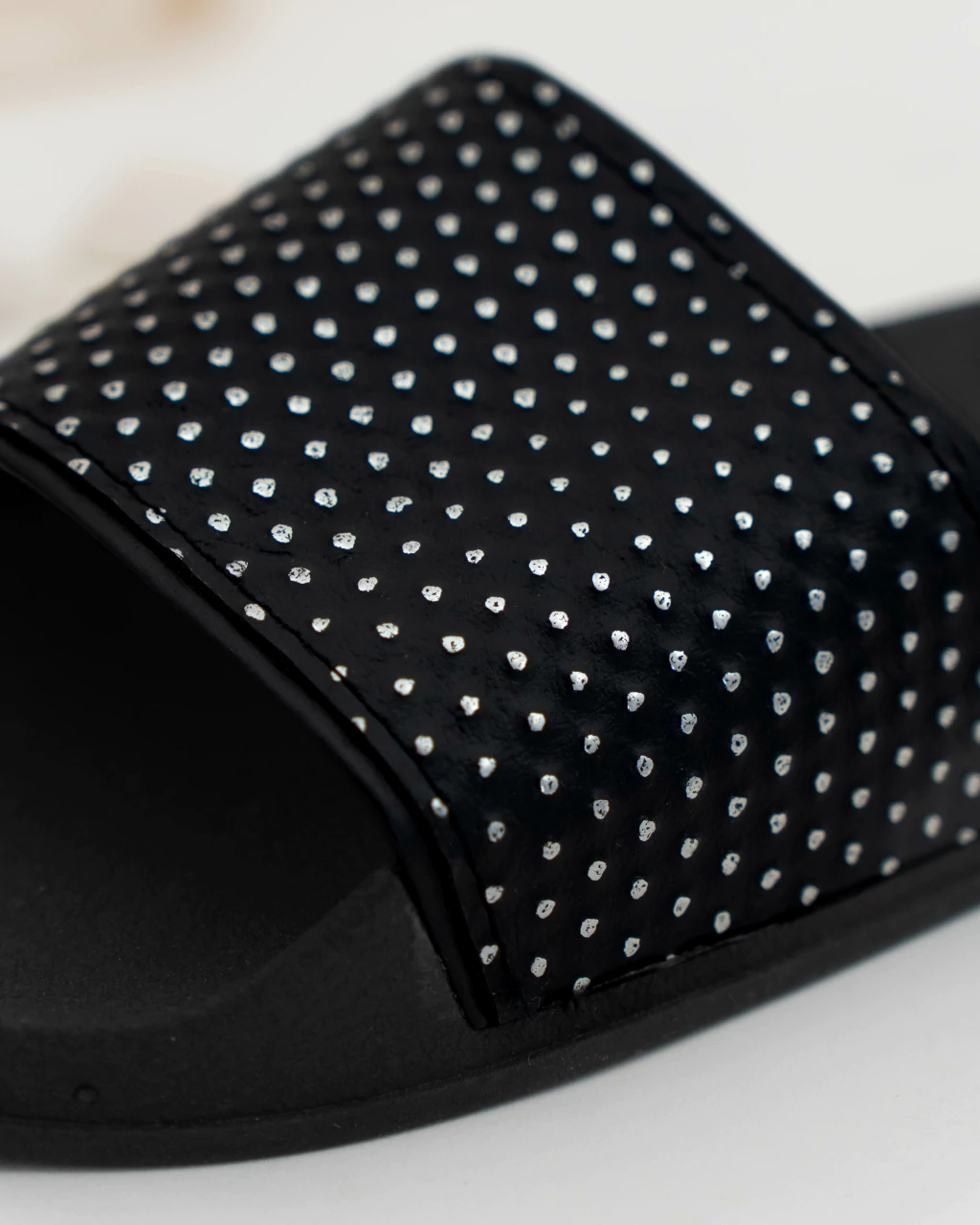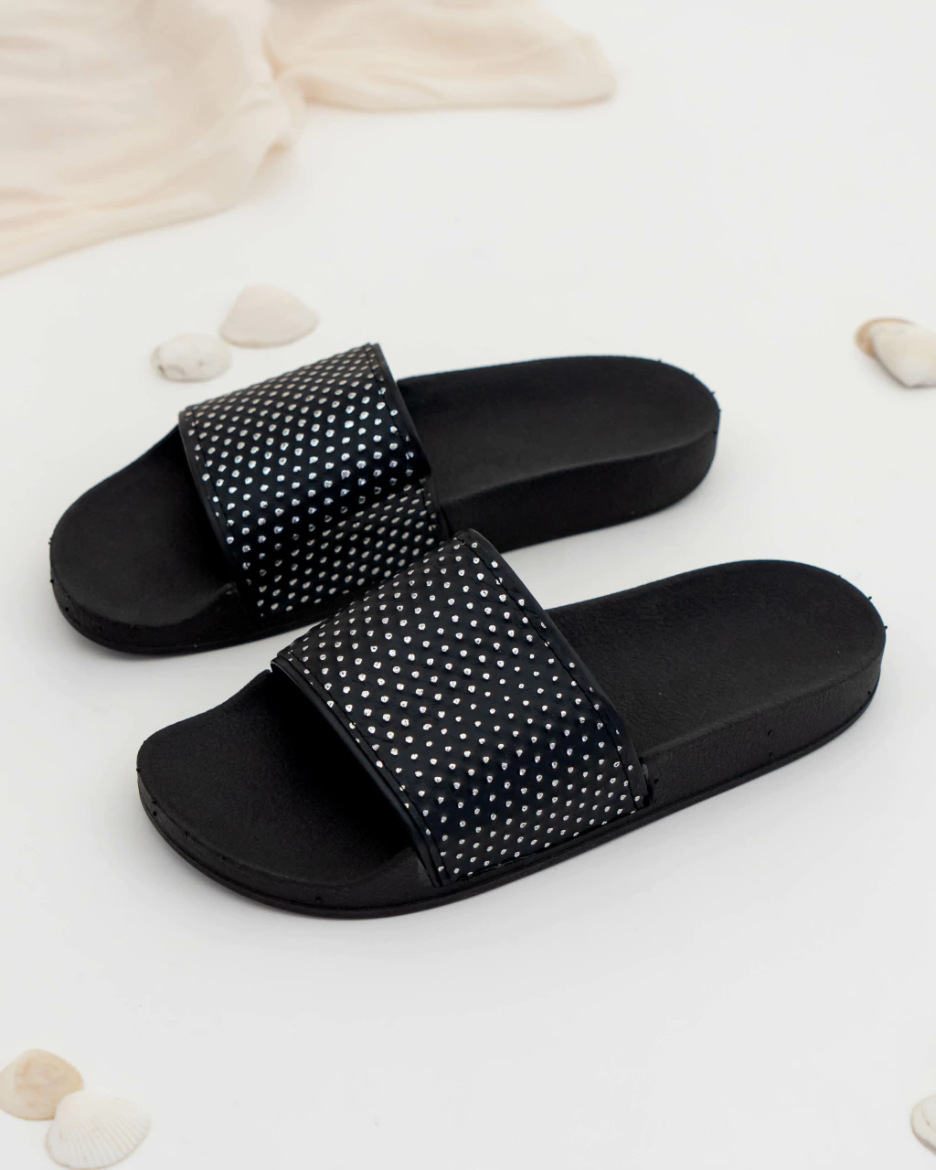 Chanclas con base de goma y capellada negra con pintitas plata. Ideales para la pile o para andar glamorosas todo el día!!!