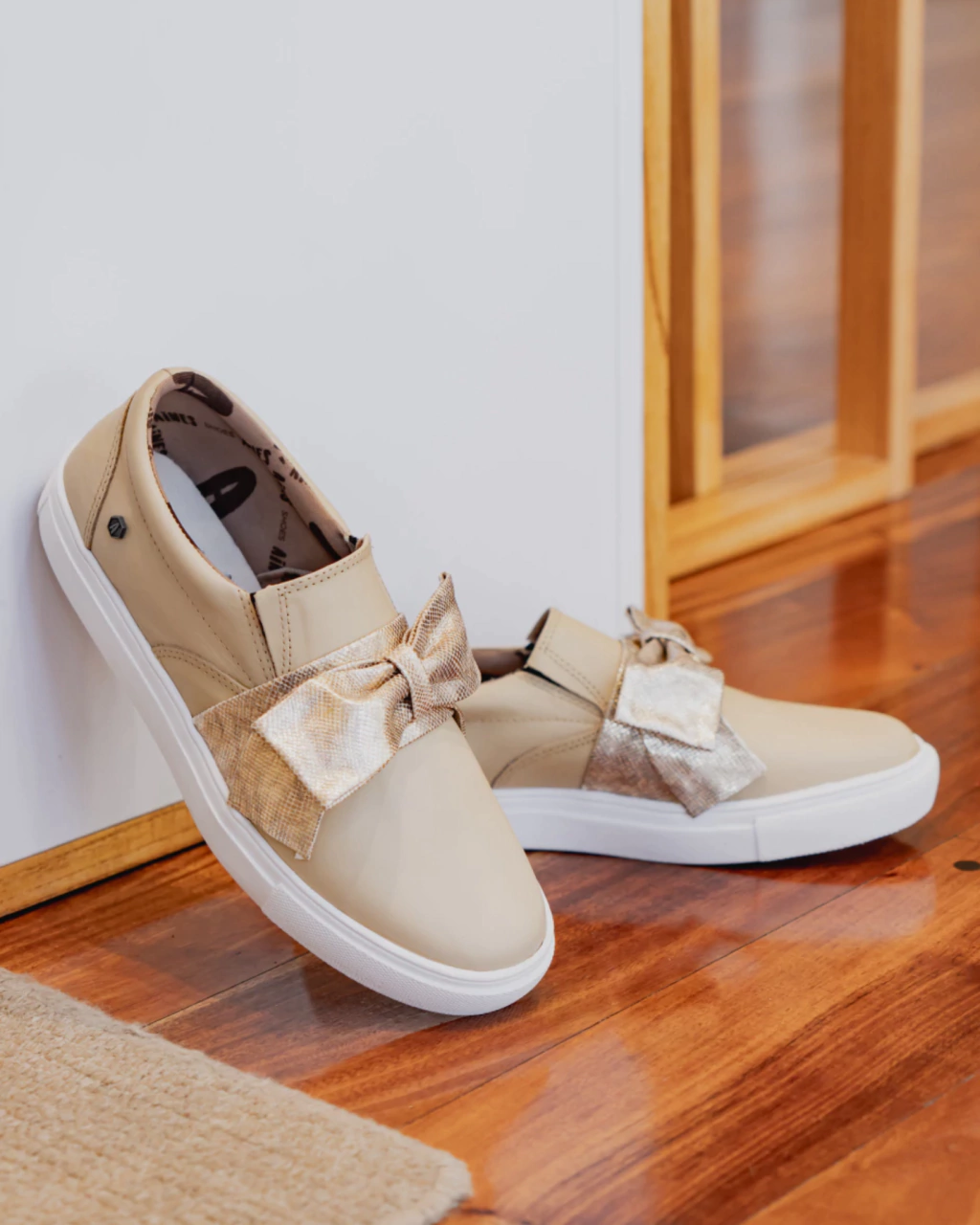 Panchas novara: Cuero beige y moño en sintético color dorado