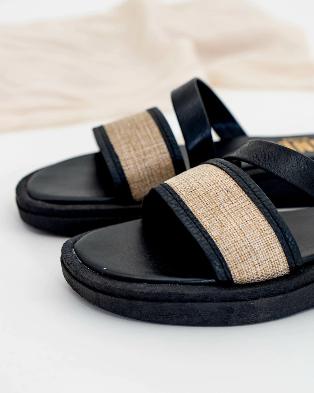 - Fajas de cuero sintético negro combinadas con rafia, que aportan un toque natural y moderno.